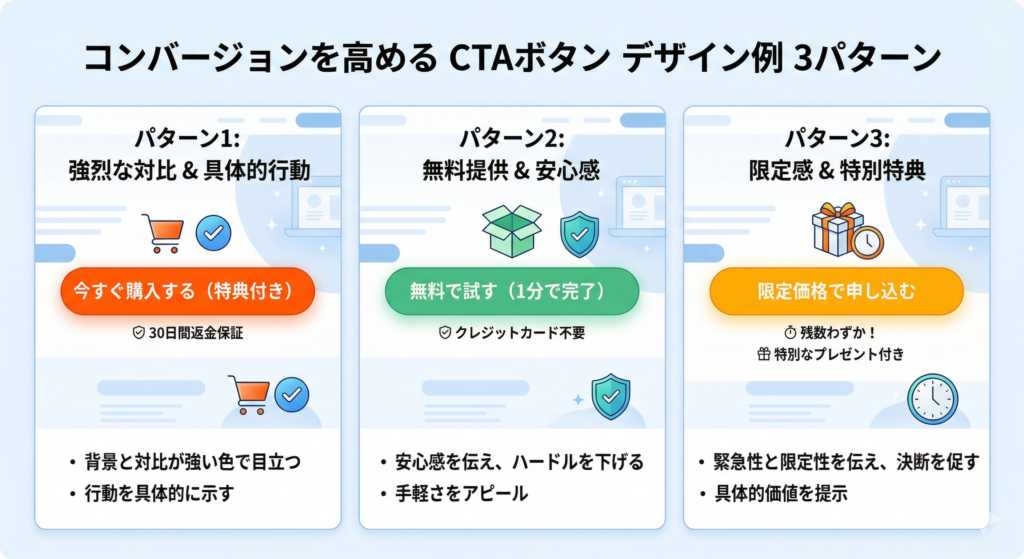 – ボタン内のテキストは「今すぐ購入する」「無料で試す」など行動を具体的に示す