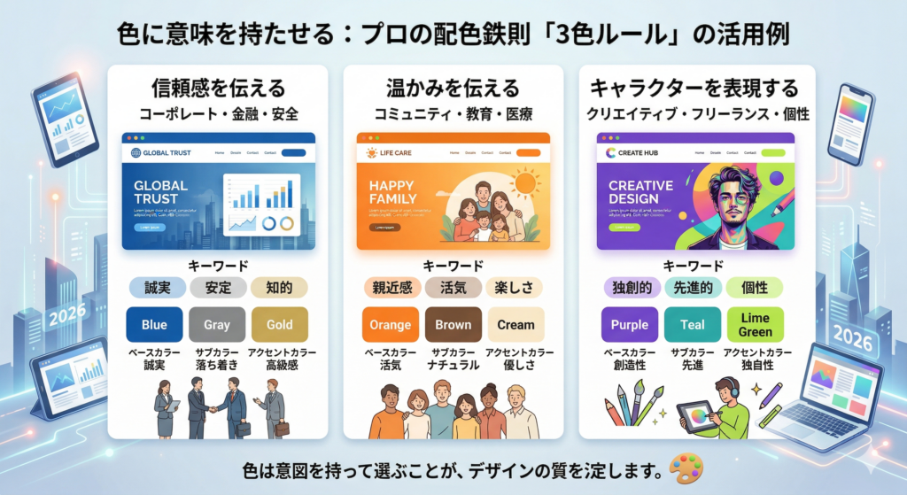 例えば、信頼感を伝えたいなら青系、温かみを伝えたいなら橙系、というように。