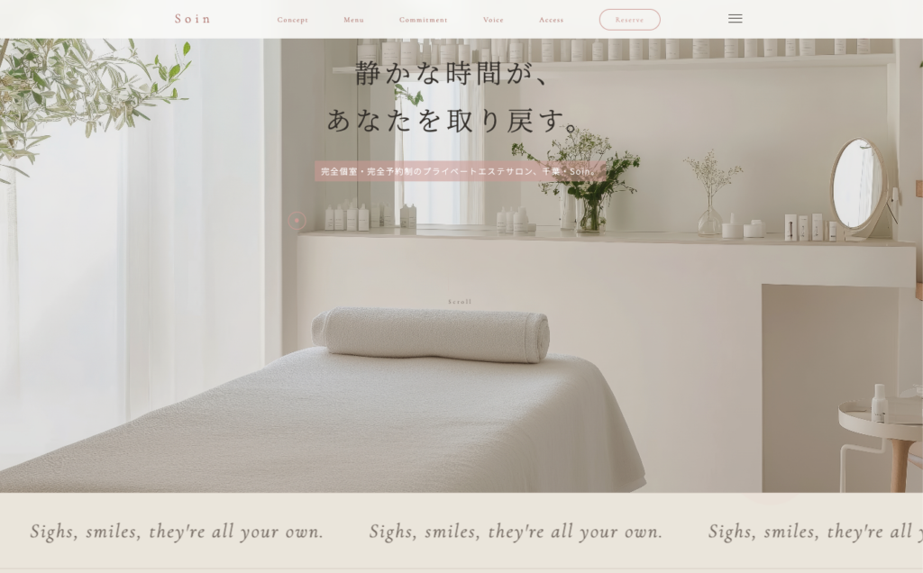 女性専用プライベートエステサロン「Soin(ソワン)」の公式Webサイト新規制作。Instagramのみで集客していたサロンが、Web経由での予約獲得を目指してサイト制作を依頼。戦略策定からデザイン・実装まで一貫して担当し、シングルページのサイトを構築し た。チェーン店的なテンプレート感を排し、完全個室・一対一の施術という体験価値を「静けさ」で表現することをゴールに設定。月間予約20件・1,500PVをKPIとした。
